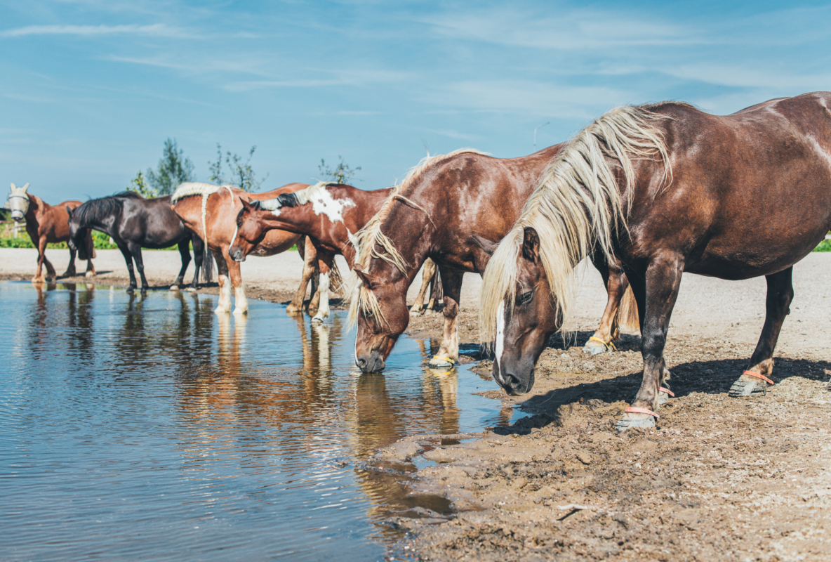 Een paard dat in een natuurlijke omgeving in de camera kijkt.